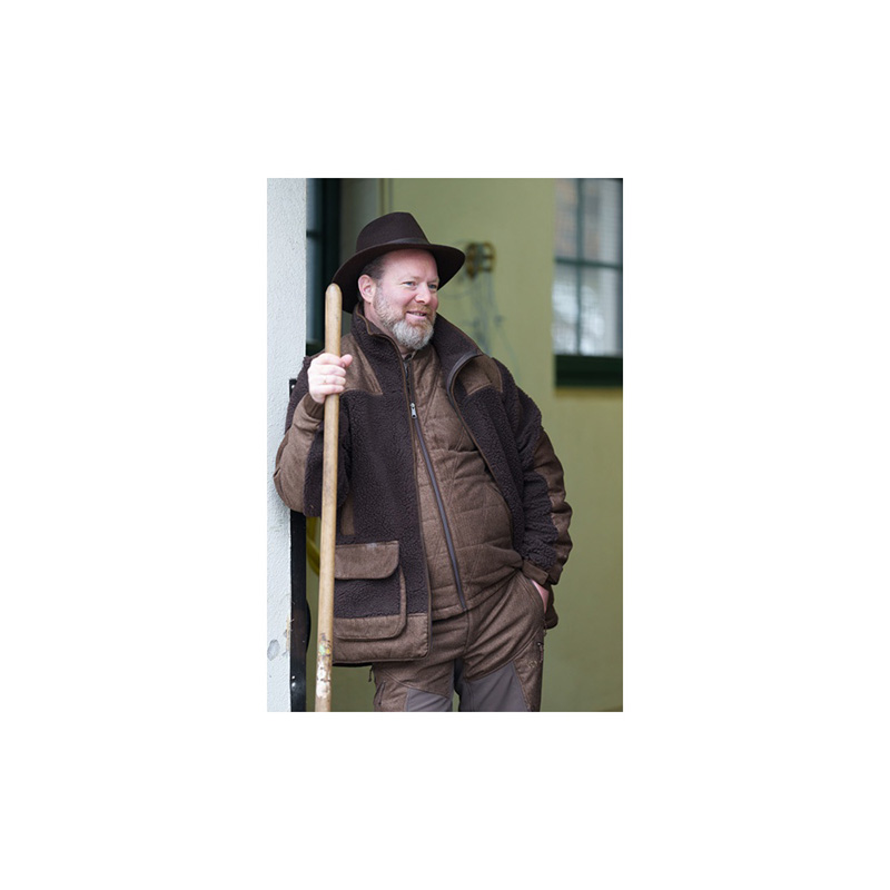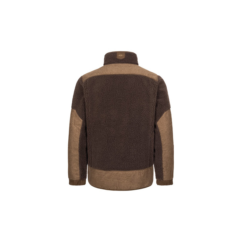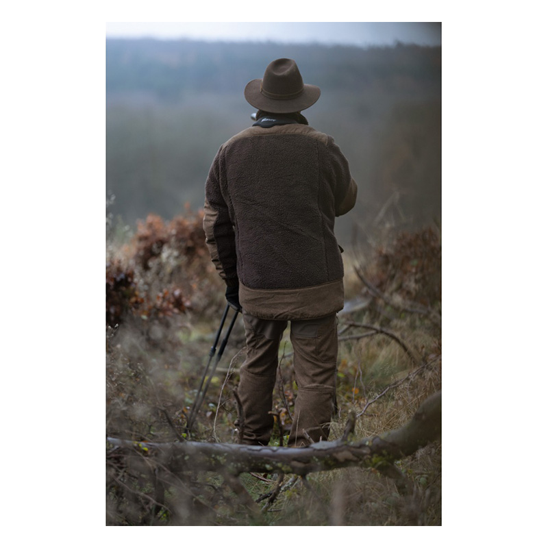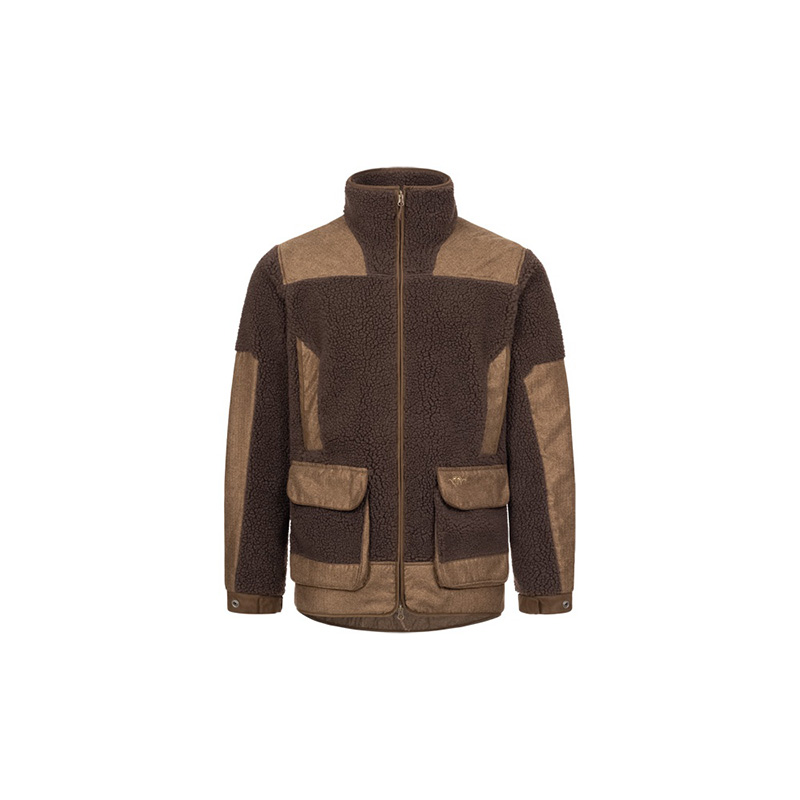 Fleecová lovecká bunda, Vintage látkové nášivky na ramenách a lakťoch, 2-cestný YKK® zips v strede vpredu, 2 vrecká na zohriatie rúk na zips, vetruodolná taftová podšívka so záhybmi v oblasti ramien pre väčšiu voľnosť pohybu, 2 vrecká s chlopňou v spodnej časti s tichými cvokmi a taftovou podšívkou na oboch stranách s pútkami na náboje, semišové lemy na celej bunde.