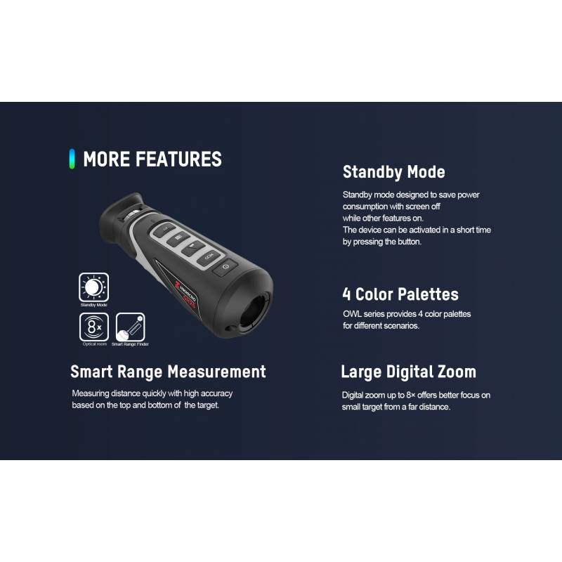 Termovízny monokulár HIKMICRO (Hikvision) OWL OH35 je vybavený kvalitným jadrom o rozlíšení 384 × 288px a displejom OLED 1024 × 768, 35mm šošovkou a diaľkomerom. Podporuje funkcie hot spot (sledovanie najteplejšieho bodu v obrazu), meranie vzdialenosti (pomocou integrovaného diaľkomeru), Wi-Fi a ďalšie. Vstavaný tepelný detektor s vysokou citlivosťou poskytuje jasný obraz aj v drsných podmienkach prostredia ako je tma, hmla, dym, prach, dážď, sneh, lesný porast atď.